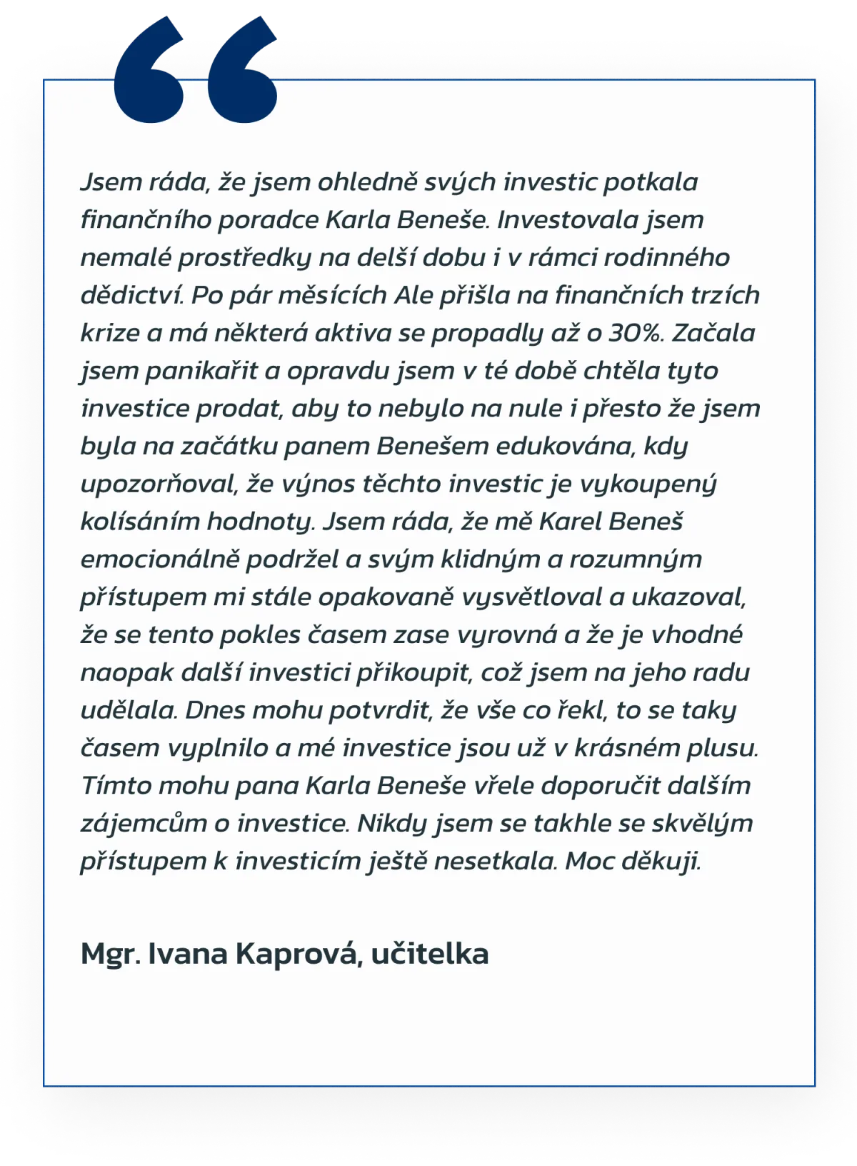 Jsem ráda, že jsem ohledně svých investic potkala finančního poradce Karla Beneše. Investovala jsem nemalé prostředky na delší dobu i v rámci rodinného dědictví. Po pár měsících Ale přišla na finančních trzích krize a má některá aktiva se propadly až o 30%. Začala jsem panikařit a opravdu jsem v té době chtěla tyto investice prodat, aby to nebylo na nule i přesto že jsem byla na začátku panem Benešem edukována, kdy upozorňoval, že výnos těchto investic je vykoupený kolísáním hodnoty. Jsem ráda, že mě Karel Beneš emocionálně podržel a svým klidným a rozumným přístupem mi stále opakovaně vysvětloval a ukazoval, že se tento pokles časem zase vyrovná a že je vhodné naopak další investici přikoupit, což jsem na jeho radu udělala. Dnes mohu potvrdit, že vše co řekl, to se taky časem vyplnilo a mé investice jsou už v krásném plusu. Tímto mohu pana Karla Beneše vřele doporučit dalším zájemcům o investice. Nikdy jsem se takhle se skvělým přístupem k investicím ještě nesetkala. Moc děkuji.